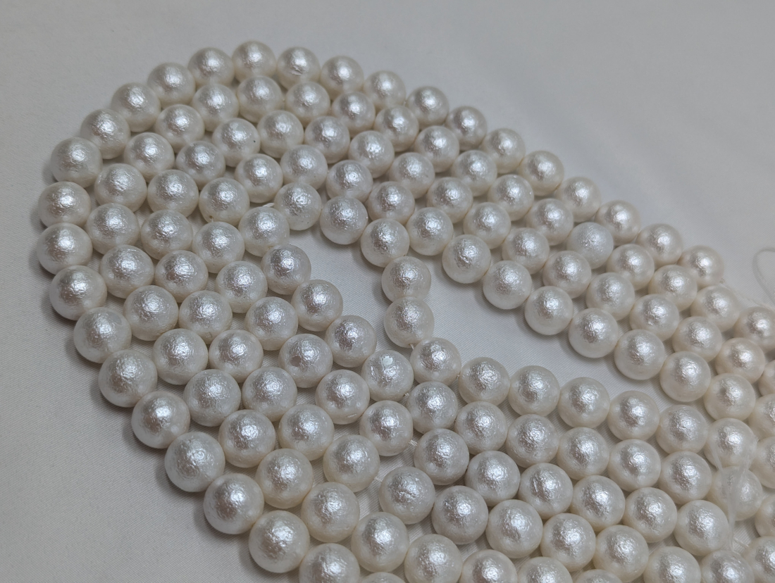 Наш Хлопковый Жемчуг изготовлен следующим образом: Жемчуга неправильной формы измельчают и помещают в формы, затем прессуют и на огромных крючках опускают в чан с разными оттенками перламутра. Так, бусинки высыхают и снова погружаются - данная техника применяется 12 раз, что является безукоризненным качеством изготовления!