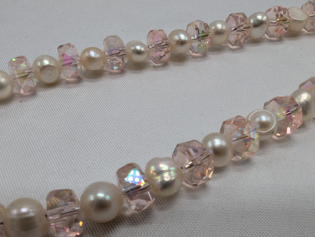 В украшении чередуется натуральный Тайландский жемчуг с нежно розового цвета Кристаллом (Элемент Сваровски). Жемчуг как бы сглаживает яркий блеск, правильно расставляя акценты в образе. Длина украшения 40см.