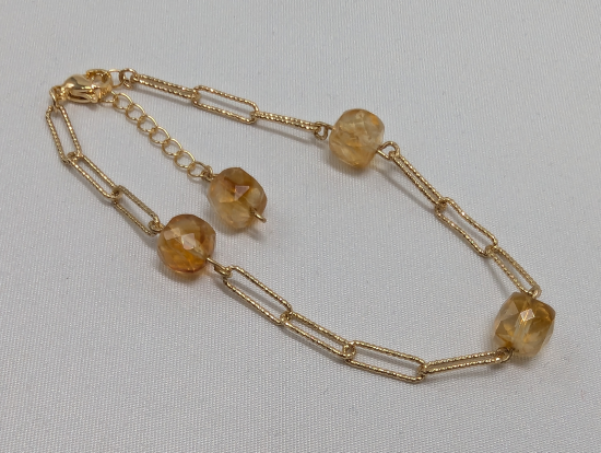 Камень Цитрин дарит силы, энергию и радость. Длина браслета 17,5 см. плюс цепочка 3 см. За счет нанизывания бусин между цепочкой браслет становится универсальным, т.к. появляются дополнительные ячейки для застегивания на любую длину.