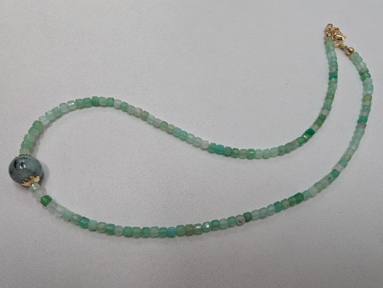Длина нашего украшения 40 см. Состоит из 1 шара по центру диаметром 10 мм. и окружающих его изумрудов малышей в форме кубиков с огранкой диаметром 4 мм.